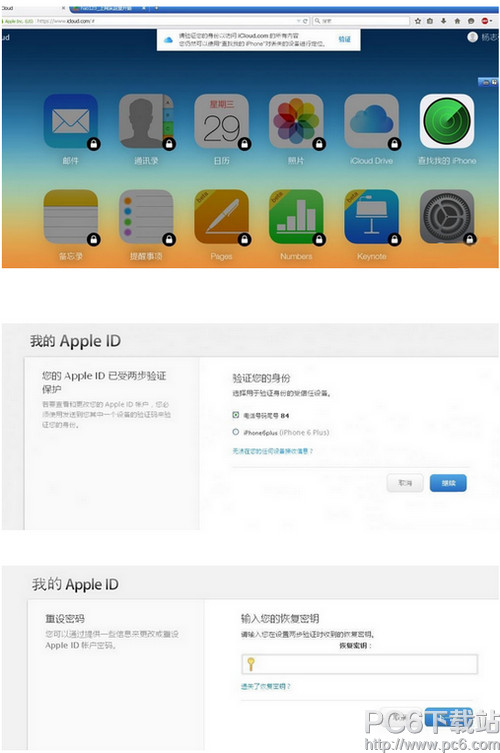 注意,完成这一步之后,我们将成功开启两步认证。那么,这个两步认证应该如何使用呢?开启两步认证之后,我们需要输入验证码才能对 iCloud 等内容进行操作。而如果你想要修改 Apple ID 的密码,则需要输入上面获得的恢复密钥,如下图所示。