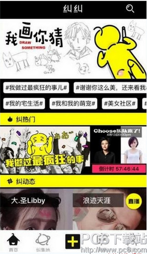 3、点击最下方中间的“+”号,用户即可快速发表图文,同时还可以加入到直播的行列中,让你可以根据任何话题和人pk,针锋相对,碰撞观点,演绎属于你自己的奇葩说;也可以和小伙伴组成cp,秀恩爱秀默契,成为纠纠直播的小s和蔡康永;当然,你还可以独自发起话题,晒宠物,炫技能,分享生活,寻找和你志同道合的伙伴们。