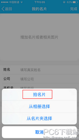 一、进入到我的名片页面之后,在其中间看到【增加名片或者相关图片】的字样,点击一下即可弹出拍名片、从相册选择以及从名片夹选择三个选项,如图所示。