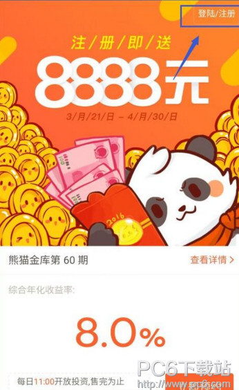 1、打开熊猫金库APP,点击右上角的登陆/注册按钮;