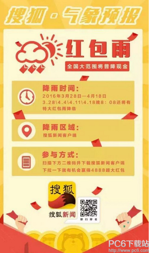 1、自3月28日起,每天在搜狐新闻客户端首页下拉看新闻,即有机会抢到现金红包,红包可直接提现到支付宝。