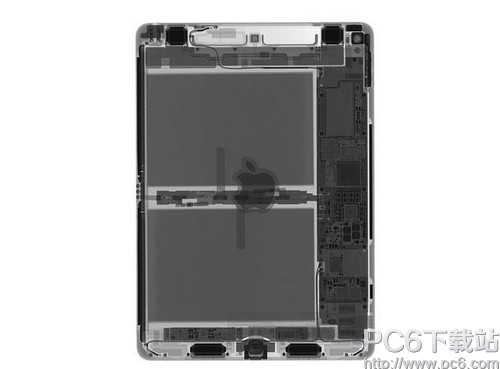 3、我们先看看9.7寸iPad Pro在X光线下的样子。Creative Electron 提供的X射线下的9.7 英寸 iPad Pro。12.9 英寸 iPad Pro 机身中四个扬声器占据了不少空间。但是在 9.7 英寸版本中,电池占据的空间比例才是最大的,逻辑板都被挤到一边了,扬声器更是被放到了角落上。中间印刷电路板上有一道很奇怪的东西是什么?只能通过拆解来看看了。
