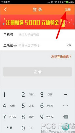 1、新用户进入登录页面后,就可以发现注册就送5000元体验金,然后点击右上角的“注册”按钮,如下图: