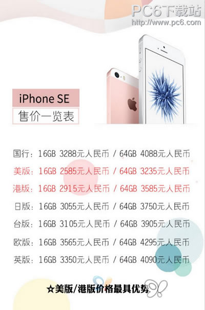 不同国家地区,iPhone SE的售价也不一样。以下是PC6下载站汇总了适合国内用户购买的版本售价,包括国行、港行、美版、日版、台版、欧版和英版。目前国内用户购买iPhone手机,比较靠谱的无非是四种渠道:大陆、香港、美国、日本,那么到底选择哪一个版本好呢?