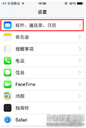 2、向下滑动,找到“邮件、通讯录、日历”的选项,点击进入