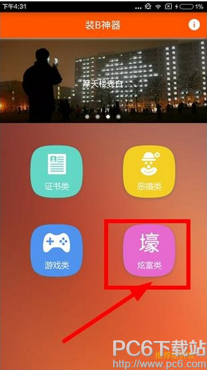 1、首先,打开装B神器主页,点击箭头所指的炫富类!