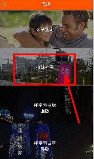 1、首先,打开装B神器主页,点击箭头所指的恶搞类位置!
