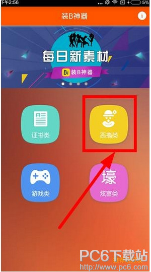 1、首先,打开装B神器主页,点击箭头所指的恶搞类位置!