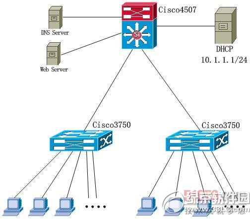 公司内网的核心层交换机使用的是Cisco 4507R,在Cisco 4507R上接有多个服务器。内网的接入层交换机使用的是Cisco 3750。内网中IP地址使用的是A类私有地址,其中内网的DHCP服务器IP地址为10.1.1.1/24。客户端都是自动从DHCP服务器获取IP地址、DNS和默认网关地址。内网的结构示意图如图1所示。