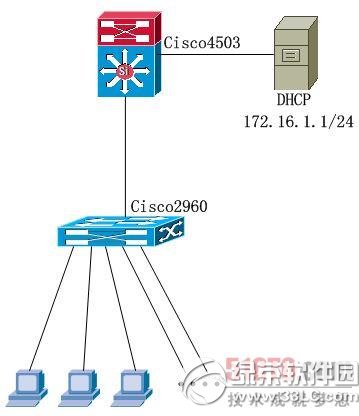 外网的核心层交换机使用的是Cisco 4503。外网的结构相对内网要简单许多,因为只要保证用户能访问互联网就行,在安全性和稳定性方面要求比较低。外网中的接入层交换机使用的是Cisco 2960。IP地址使用的是B类私有地址。外网中只使用了一台服务器,即DHCP服务器,IP地址为172.16.1.1/24。同样,外网中的客户端也是自动从DHCP服务器上获取IP地址、DNS和默认网关地址。外网的网络结构图如图2所示。