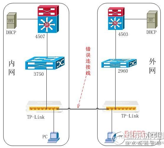 引起网络崩溃的错误连接发生在同一个办公室中。错误连接的示意图,如图3所示。因为这个办公室中的内网和外网的信息点都很少,所以在用户接入内网和外网时,都使用了一个TP-Link的8端口交换机。发生故障前,办公室一用户发现自己的电脑不能访问互联网,就在不明白网络运行原理的情况下,看到房间中有两个TP-Link交换机,错误的认为是因为这两个小交换机没有连接起来而引起的故障,就找了一根网线,把两个TP-Link交换机连了起来,结果导致公司内网和外网大面积的网络崩溃。