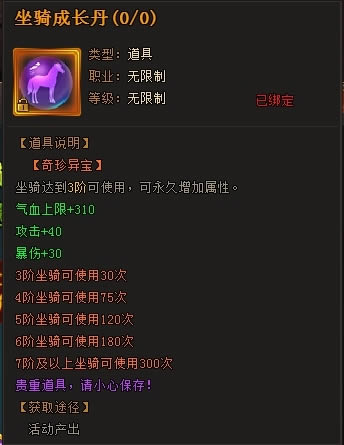 坐骑达到3阶后,将可以喂食成长丹,成长丹可以百分比增加坐骑的进阶属性;
