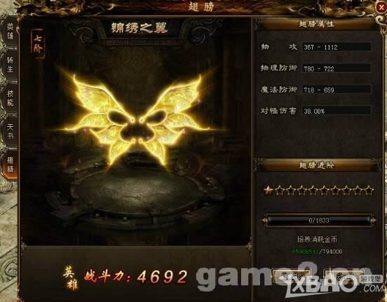 英雄翅膀每阶分为10星,进度条满则升星,升阶期间没有升满的不清空进度,条每升1星都会带来属性战力加成。