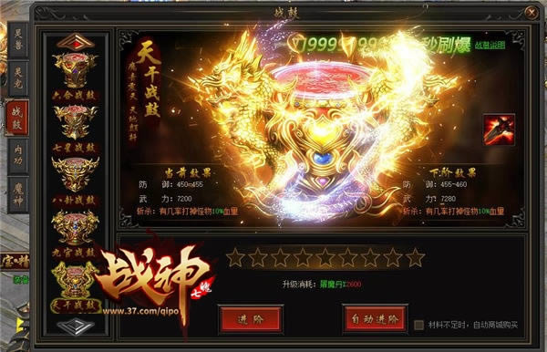 灵宠,顾名思义,就是属于你的专属宠物,能够为你增加属性,而战鼓则是帮你消耗怪物血量的神器,升级战鼓,将为37《七魄》的玩家带来随机技能斩杀,它有几率秒杀怪物最大10%血量,而且斩杀效果只对怪物生效。
