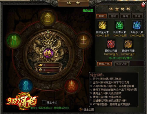当玩家所在9377屠龙战记区服达到开服7天,并且角色等级满足5转或以上,就能使用炼金系统的。大家从界面下方的“炼金”图标,进入到炼金界面,就能进行炼金操作。游戏中的炼金分为两种金币炼金和元宝炼金。