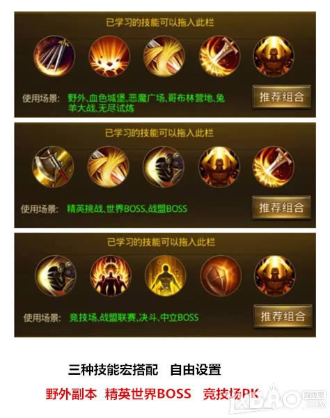点完天赋,角色已掌握的技能十分丰富,37《大天使之剑H5》一共提供了副本野外挂机、精英世界BOSS挑战、竞技场PK三种不同场景的技能宏方案。所以,我们可以根据技能属性合理设置技能,以便在不同场景取得战局优势!