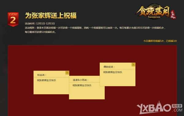 有礼包,有蜡烛,怎么能没有蛋糕!《贪玩蓝月》精心为代言人张家辉准备一个大型蛋糕盘,凡为张家辉送上都真挚的祝福,就可获得一个张家辉小蛋糕,每日累计充值100元还可获得一次送祝福的机会,最多可获得5次送祝福机会。一天5个小蛋糕,再也不怕不能和明星一起过生日了。