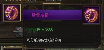 从VIP5开始便能获得的紫金装备其中之一,这次赠送的是一枚紫金戒指。同样地,小R玩家直接装备,大R玩家分解合成更高阶的戒指。