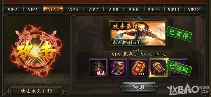 VIP5攻击暴增(永久超强buff)攻击永久+40,可以获得的道具有:紫金鞋*1、威望*2000、招将令*4、借兵令*15。
